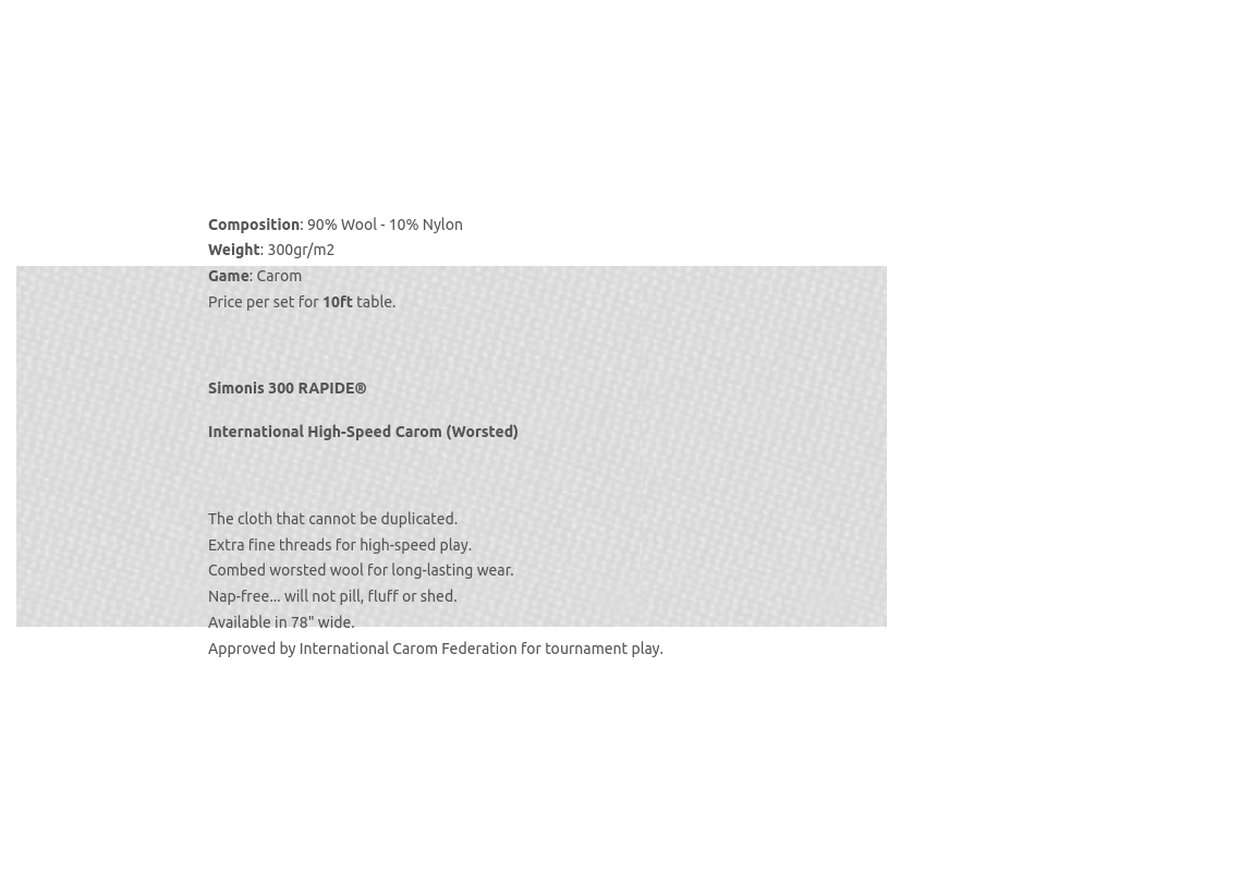 Η τσόχα έρχεται έτοιμη κομμένη σετ (πάτωμα και σπόντες χωριστά) και ταιριάζει σε όλα τα γαλλικά μπιλιάρδα ανεξαρτήτως μεγέθους.
