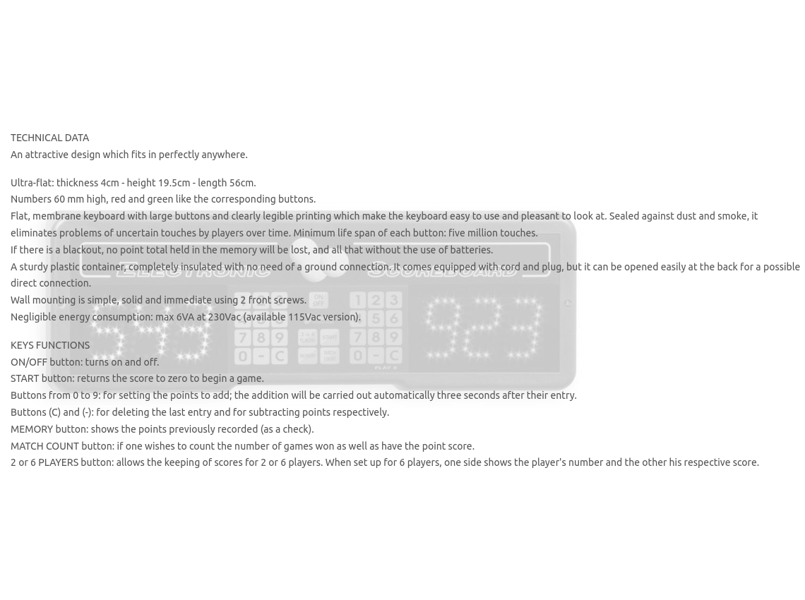 Flat, membrane keyboard with large buttons and clearly legible printing which make the keyboard easy to use and pleasant to look at. Sealed against dust and smoke, it eliminates problems of uncertain touches by players over time. Minimum life span of each button: five million touches.