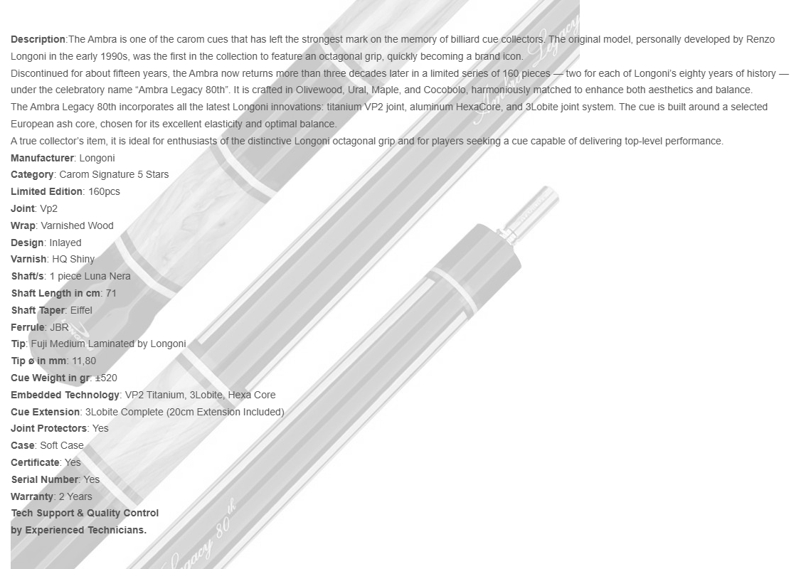 A true collector’s item, it is ideal for enthusiasts of the distinctive Longoni octagonal grip and for players seeking a cue capable of delivering top-level performance.