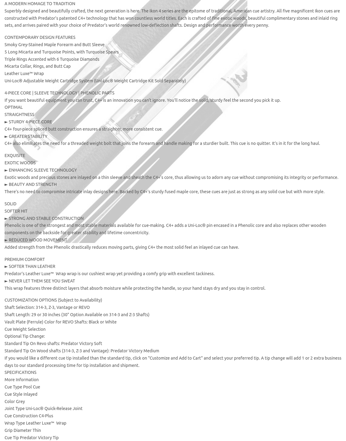 Superbly designed and beautifully crafted, the next generation is here. The Ikon 4 series are the epitome of traditional, American cue artistry. All five magnificent Ikon cues are constructed with Predator’s patented C4+ technology that has won countless world titles. Each is crafted of fine exotic woods, beautiful complimentary stones and inlaid ring sets, and arrives paired with your choice of Predator’s world renowned low-deflection shafts. Design and performance worth every penny.