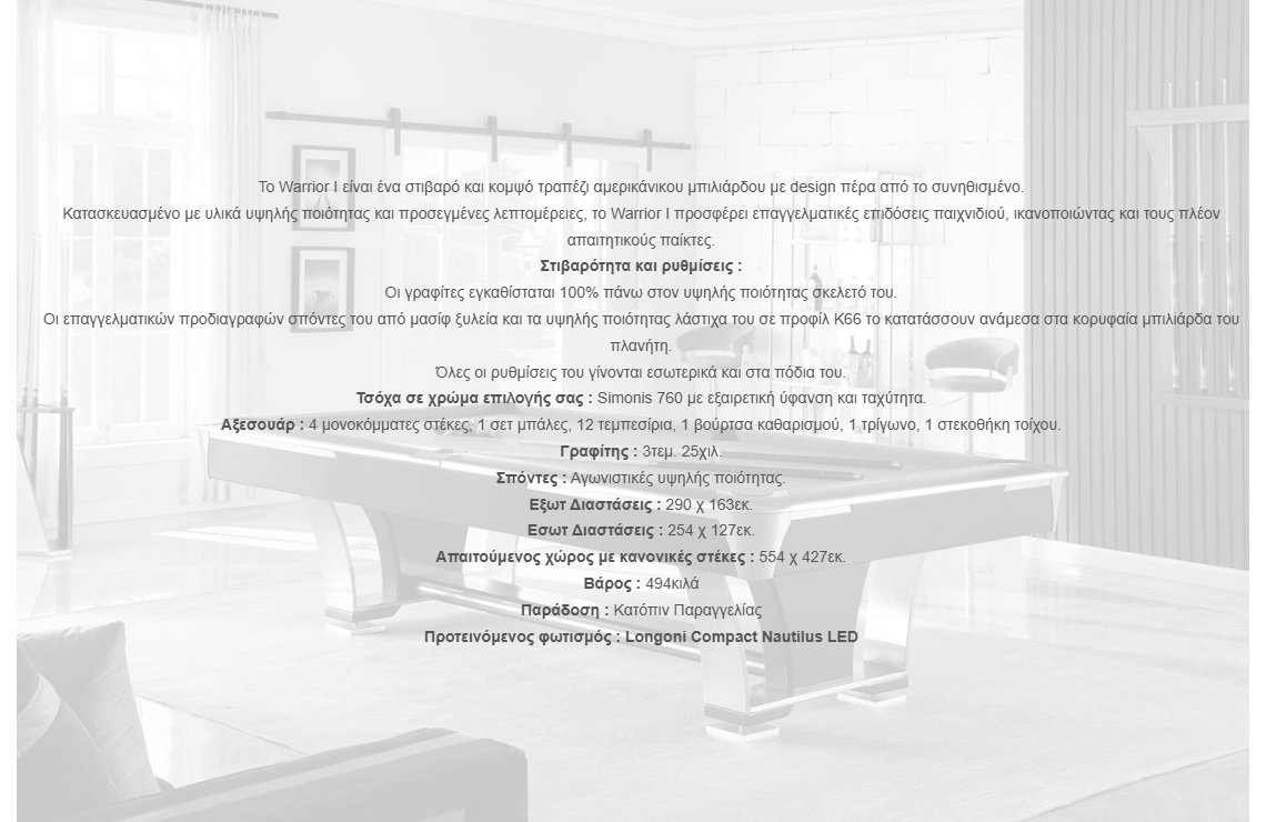 Το Warrior I είναι ένα στιβαρό και κομψό τραπέζι αμερικάνικου μπιλιάρδου με design πέρα από το συνηθισμένο.