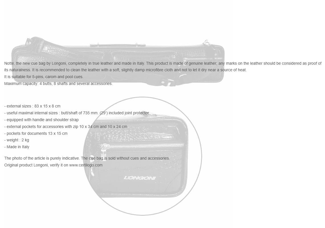 Notte, the new cue bag by Longoni, completely in true leather and made in Italy. This product is made of genuine leather; any marks on the leather should be considered as proof of its naturalness. It is recommended to clean the leather with a soft, slightly damp microfibre cloth and not to let it dry near a source of heat.