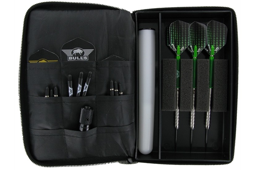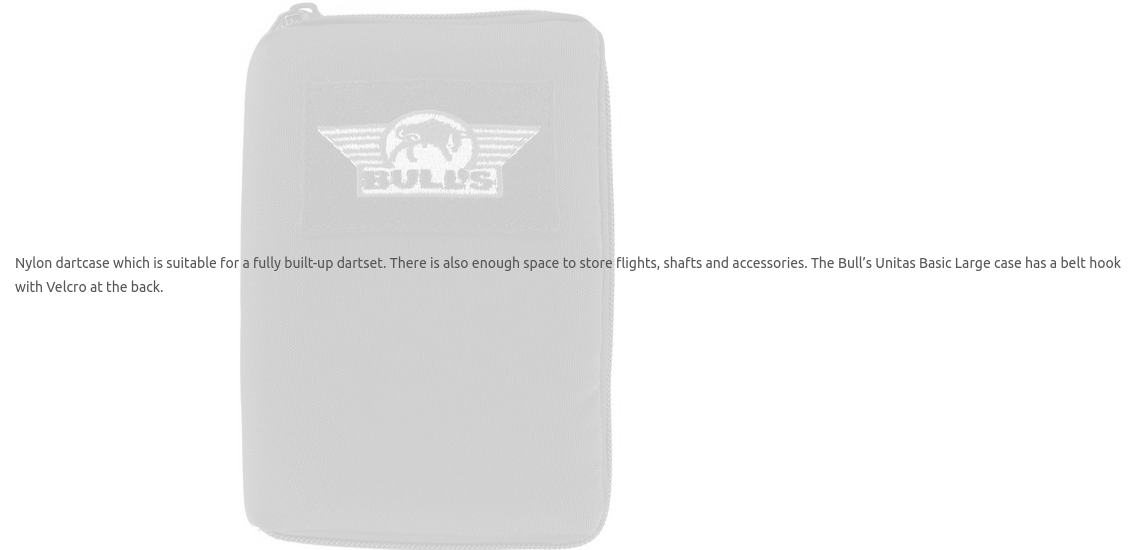 Nylon dartcase which is suitable for a fully built-up dartset. There is also enough space to store flights, shafts and accessories. The Bull’s Unitas Basic Large case has a belt hook with Velcro at the back.