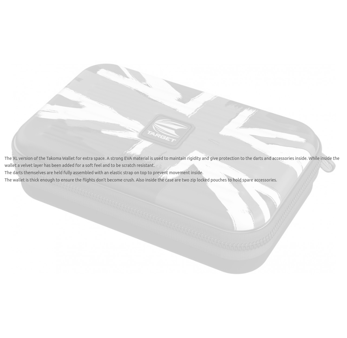 The XL version of the Takoma Wallet for extra space. A strong EVA material is used to maintain rigidity and give protection to the darts and accessories inside. While inside the wallet a velvet layer has been added for a soft feel and to be scratch resistant.