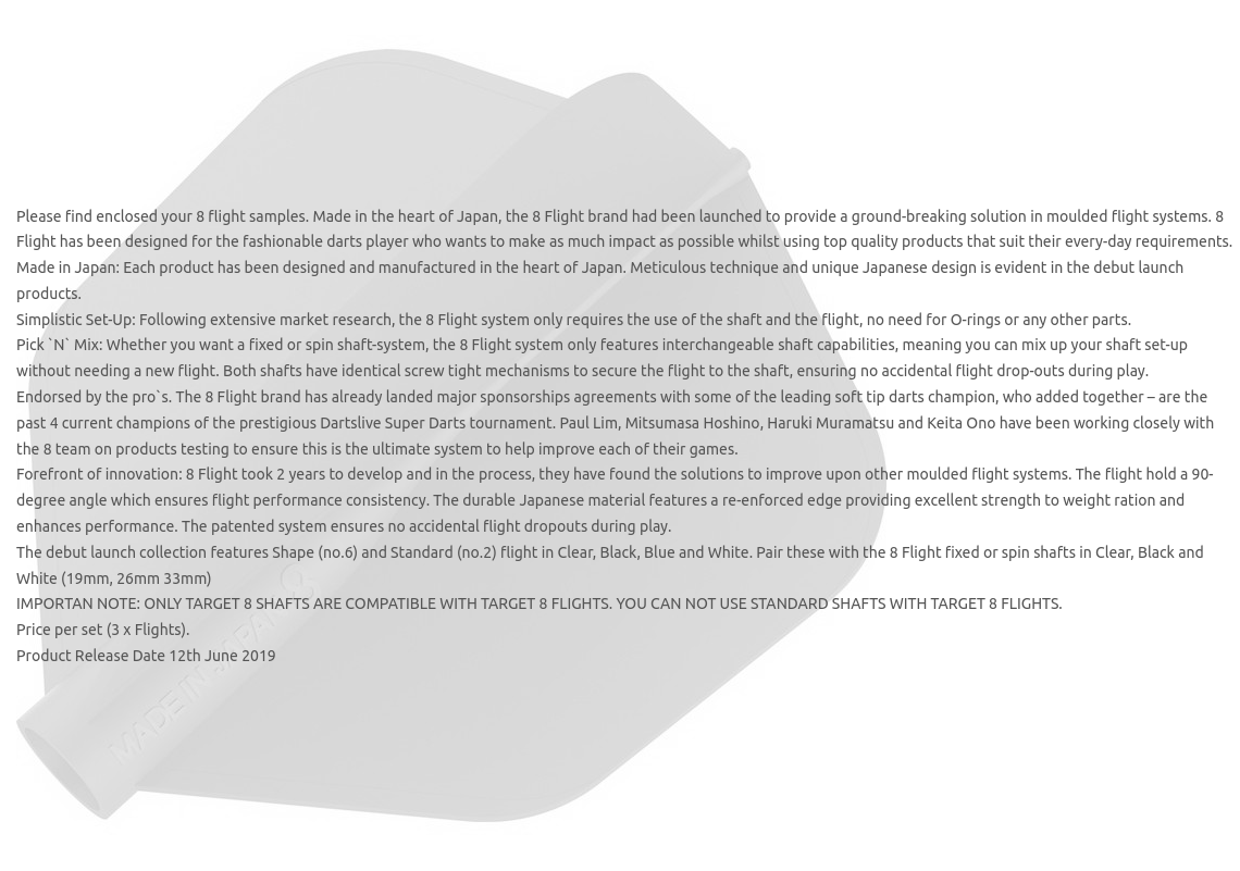 Please find enclosed your 8 flight samples. Made in the heart of Japan, the 8 Flight brand had been launched to provide a ground-breaking solution in moulded flight systems. 8 Flight has been designed for the fashionable darts player who wants to make as much impact as possible whilst using top quality products that suit their every-day requirements.