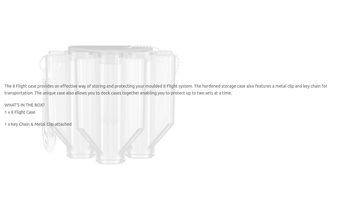 The 8 Flight case provides an effective way of storing and protecting your moulded 8 Flight system. The hardened storage case also features a metal clip and key chain for transportation. The unique case also allows you to dock cases together enabling you to protect up to two sets at a time.