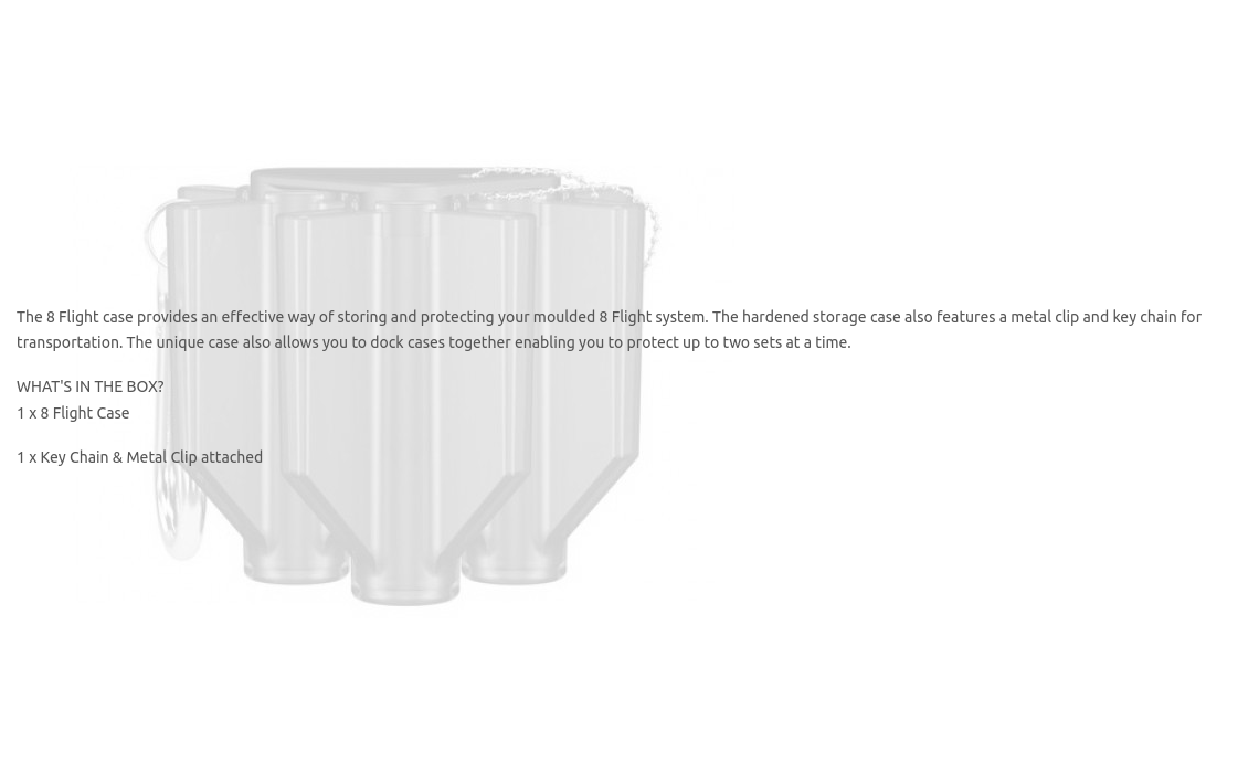 The 8 Flight case provides an effective way of storing and protecting your moulded 8 Flight system. The hardened storage case also features a metal clip and key chain for transportation. The unique case also allows you to dock cases together enabling you to protect up to two sets at a time.