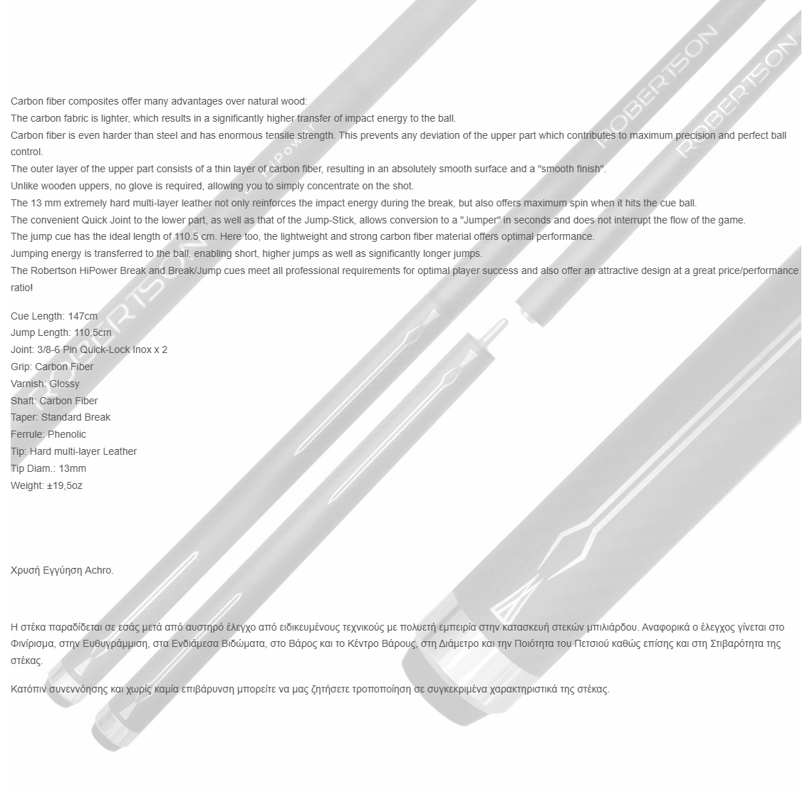 The Robertson HiPower Break and Break/Jump cues meet all professional requirements for optimal player success and also offer an attractive design at a great price/performance ratio!