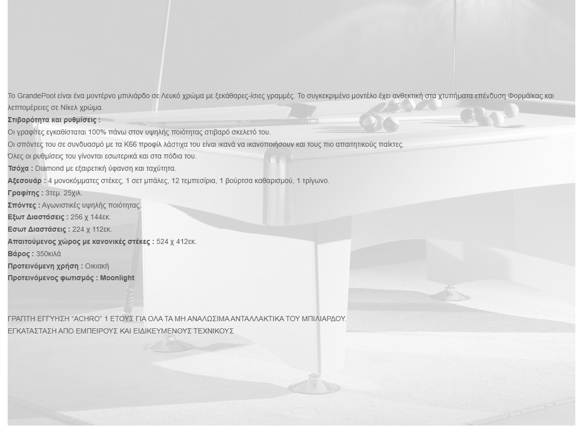 Το GrandePool είναι ένα μοντέρνο μπιλιάρδο σε Λευκό χρώμα με ξεκάθαρες-ίσιες γραμμές. Το συγκεκριμένο μοντέλο έχει ανθεκτική στα χτυπήματα επένδυση Φορμάϊκας και λεπτομέρειες σε Νίκελ χρώμα.