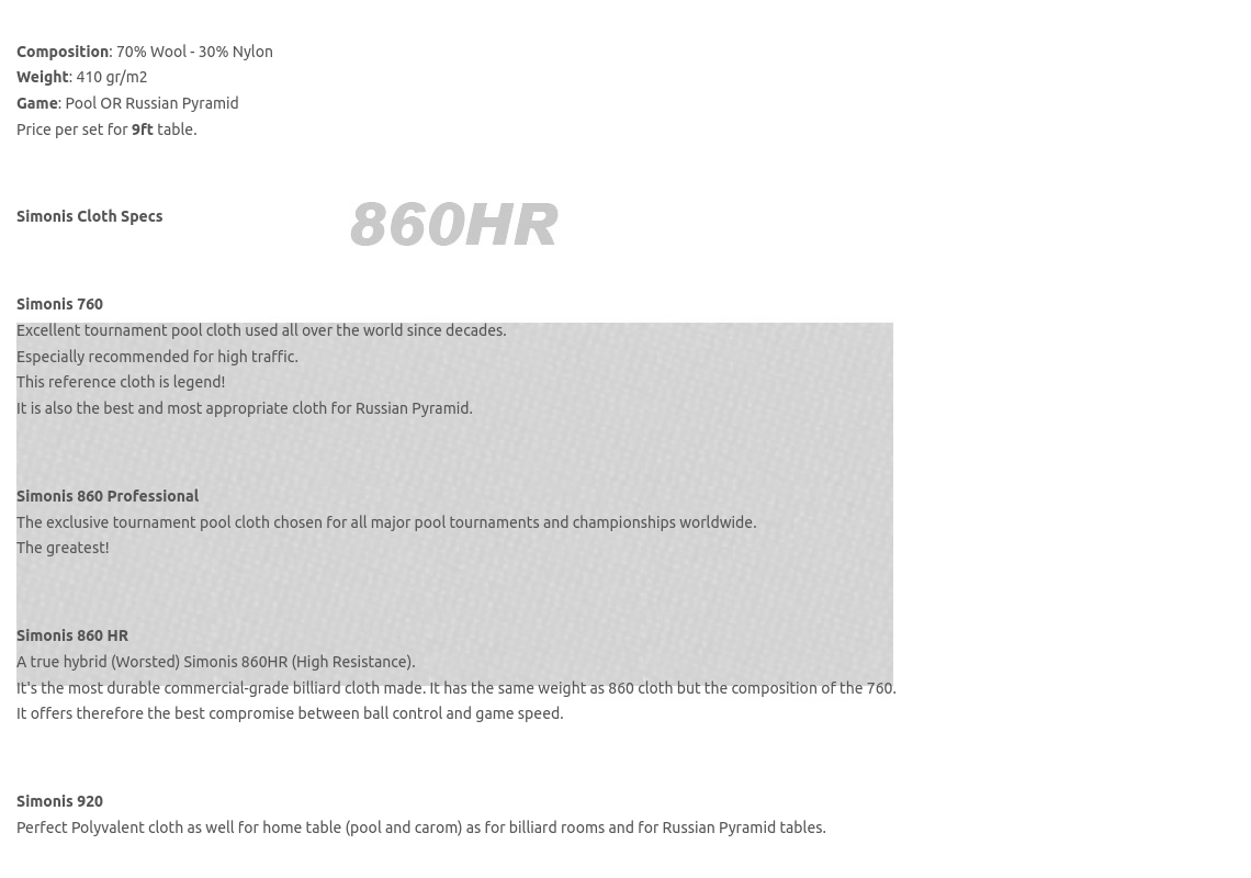 It's the most durable commercial-grade billiard cloth made. It has the same weight as 860 cloth but the composition of the 760.