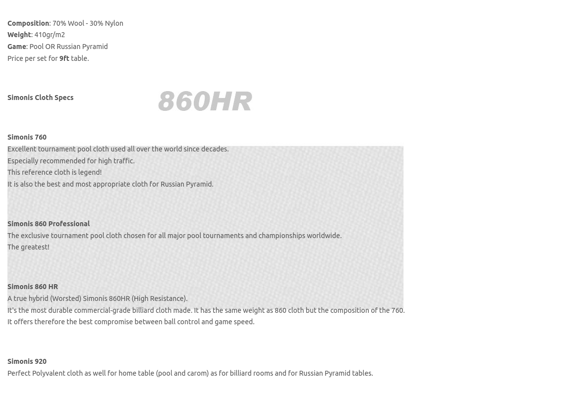 It's the most durable commercial-grade billiard cloth made. It has the same weight as 860 cloth but the composition of the 760.
