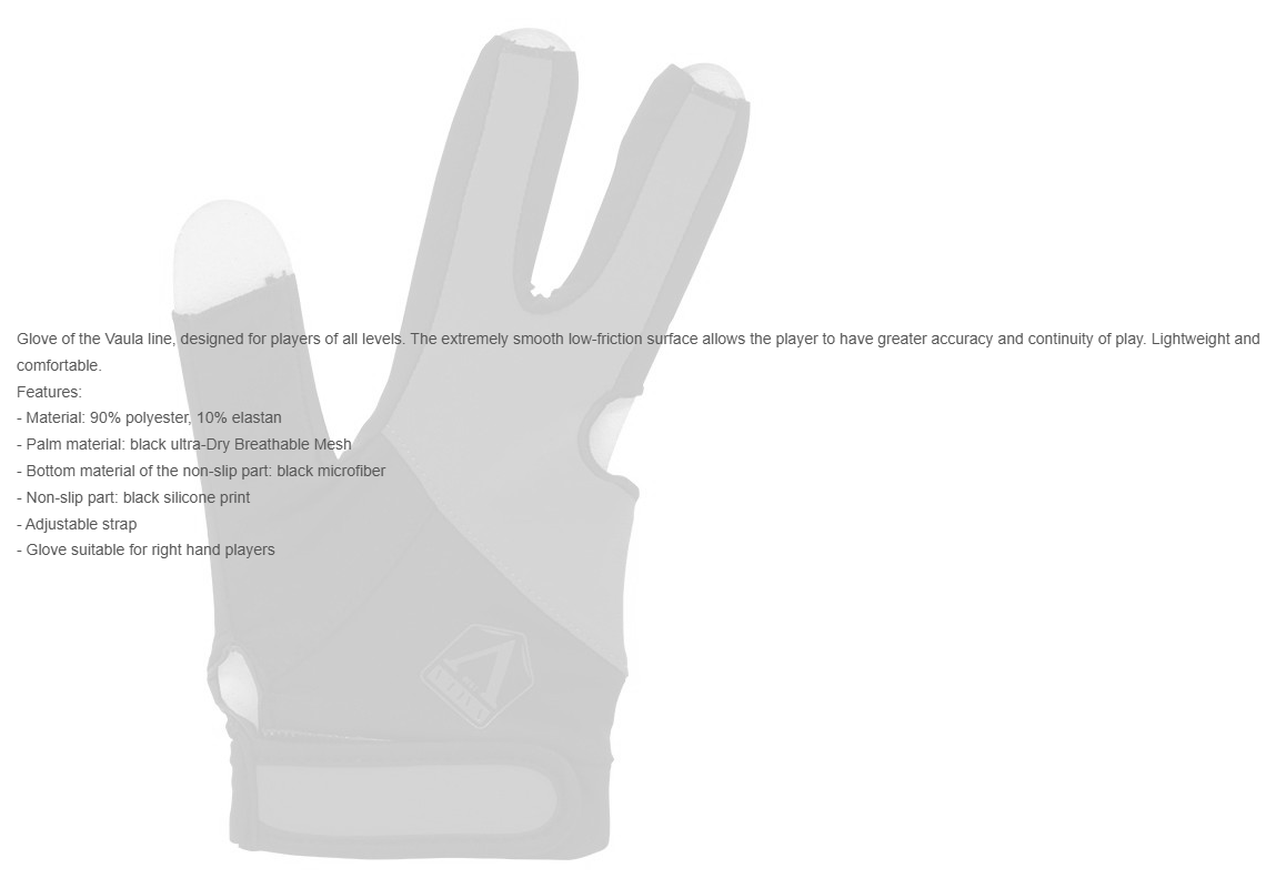 Glove of the Vaula line, designed for players of all levels. The extremely smooth low-friction surface allows the player to have greater accuracy and continuity of play. Lightweight and comfortable.