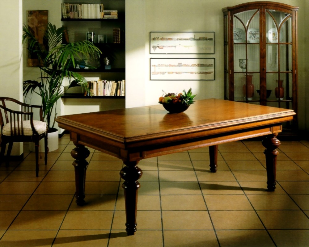 Clear and timeless elegant table, Luigi XVI style. Entirely solid wood handmade table with 4 turned adjustable legs. 3 Pieces slate allows the installation even in that rooms which are not easily reachable. A two pieces veneered table top in the same color as the aprons is supplied with the billiard. The balls, in the pool version, fall into cotton net pockets, hidden when the billiard becomes table. Available in the pool or carom version, only 7,5’.