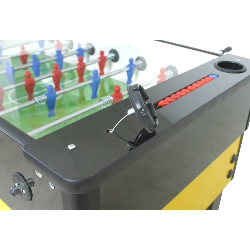 Made of plywood plated with 26mm plastic laminate, corners in black anodized aluminium. Model with G07 coinshute. Supplied with a ball return system studied to revent thefts. With four bottle trays. Black/yellow version.