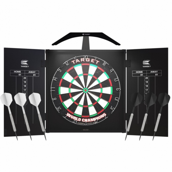 The sleek black cabinet set comes complete with Target's World Champions dartboard, Arc Lighting System, 2 x sets of brass darts, and dry erase marker to ensure your set up is fully equipped.