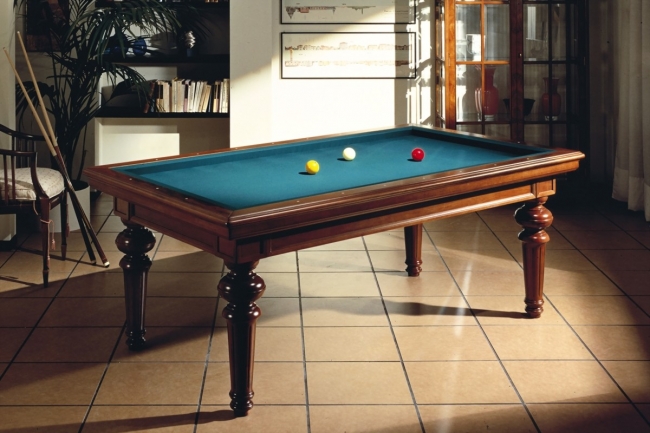 Clear and timeless elegant table, Luigi XVI style. Entirely solid wood handmade table with 4 turned adjustable legs. 3 Pieces slate allows the installation even in that rooms which are not easily reachable. A two pieces veneered table top in the same color as the aprons is supplied with the billiard. The balls, in the pool version, fall into cotton net pockets, hidden when the billiard becomes table. Available in the pool or carom version, only 7,5’.