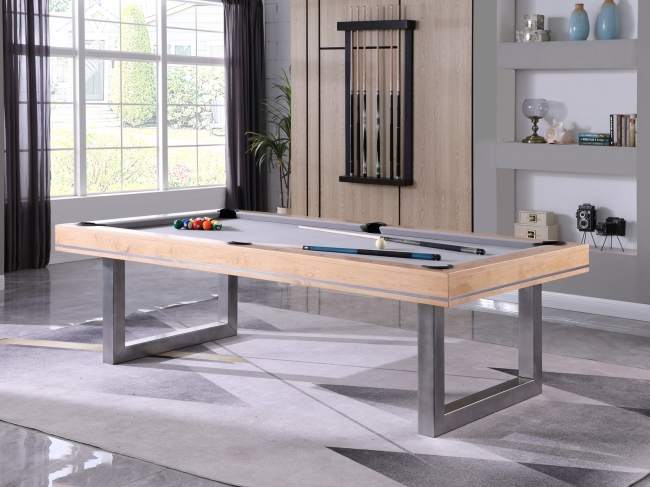 Πανέμορφο, μοντέρνο και στιβαρό μπιλιάρδο τραπεζαρία σε Maple Finish και μασίφ Metal Look πόδια. Οι τσέπες του είναι από γνήσιο δέρμα και εμπλουτίζουν το σχέδιο του τραπεζιού.
